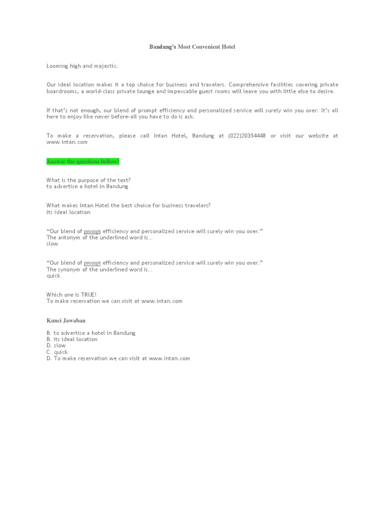 Soal Brochure Dengan Jawaban Brainly Co Id from id-static.z-dn.net If that's not enough, our blend of prompt efficiency and personalized service will surely win you over. What makes intan hotel the best choice for business travelers? Maybe you would like to learn more about one of these? We did not find results for: Bandung's most convenient hotel looming high and majestic. Check spelling or type a new query. To make a reservation, please call intan hotel, bandung at (022)20354448 or visit our website at www.intan.com. Our ideal location makes it a top choice for business and travelers.